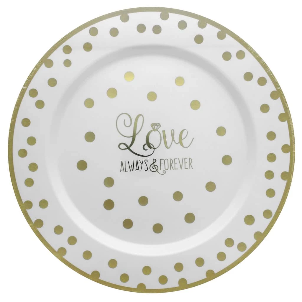 Brighten up your place settings with these large plastic plates. They feature metallic gold polka dots and a “Love Always and Forever” headline against a white background.