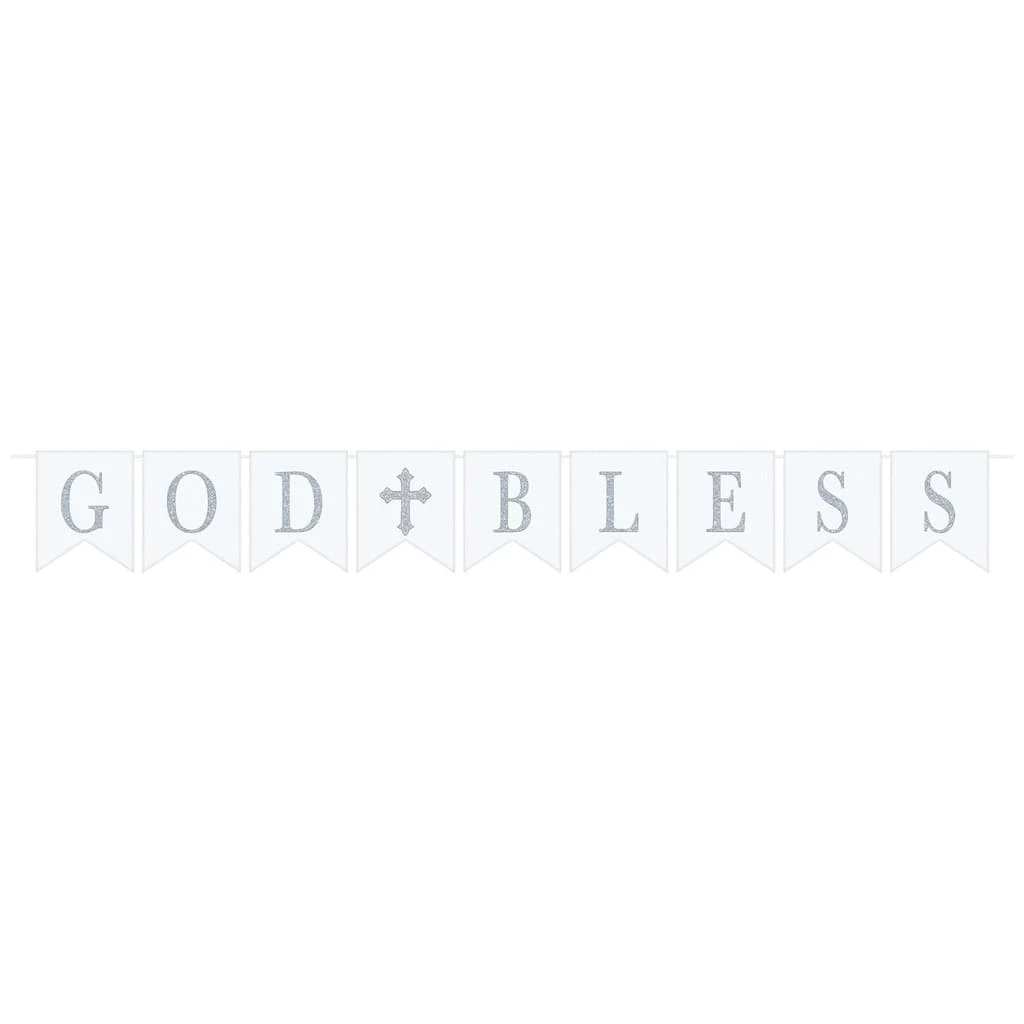 Decorate for your religious event with our Religious God Bless Pennant Banner. This sparkling banner features nine pennants that spell out “God Bless” and is spaced out by a cross. Hang this banner from the attached ribbon to welcome God in your home.