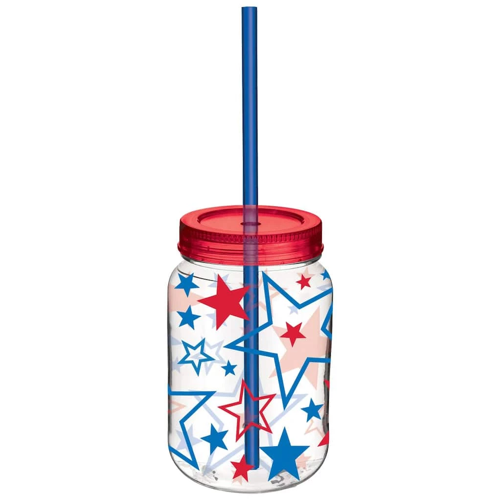 Keep cool in the American summer with these Patriotic Mason Jar Cups with Straws. These cute cups feature a colorful star print, screw top lid, and plastic straw. Fill these sturdy plastic cups with your favorite cold beverage and you’ll be ready to beat the summer heat.