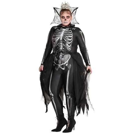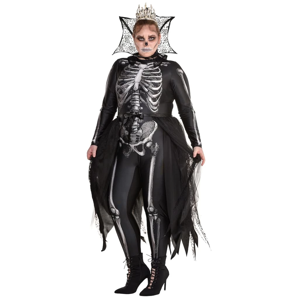 Who said death would stop your reign? Rule over the dead and the living with this Gothic Skeleton Queen Costume. This commanding costume features a bone printed bodysuit with high, royal collar, and tie on tulle bustle. Top off the look with the bone finger crown.