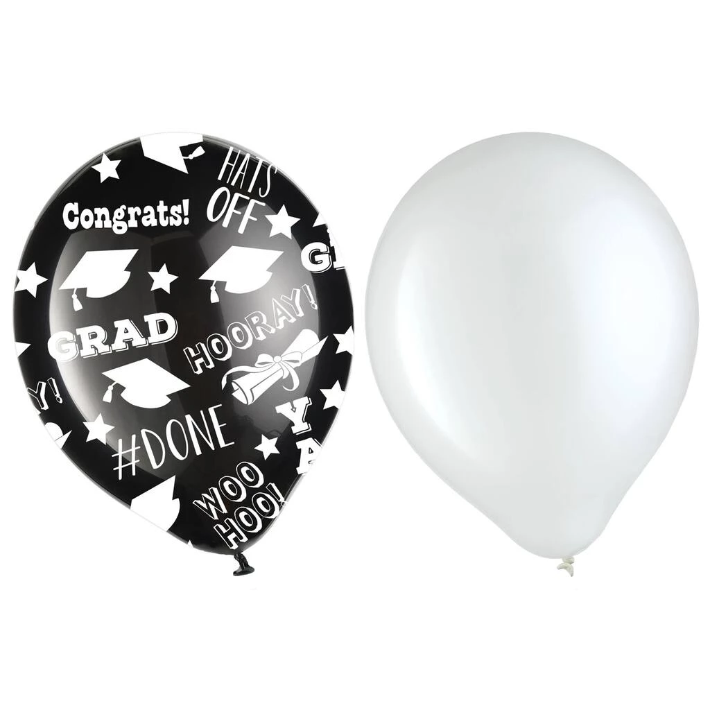 ConGRADulations! Decorate your graduation party space with these black and white Graduation Balloons. This pack contains black balloons with an all-over pattern including graduation caps, diplomas, stars, and inspiring messages, as well as solid white balloons. Display the balloons in one bouquet attached to a balloon weight or let them roam free.