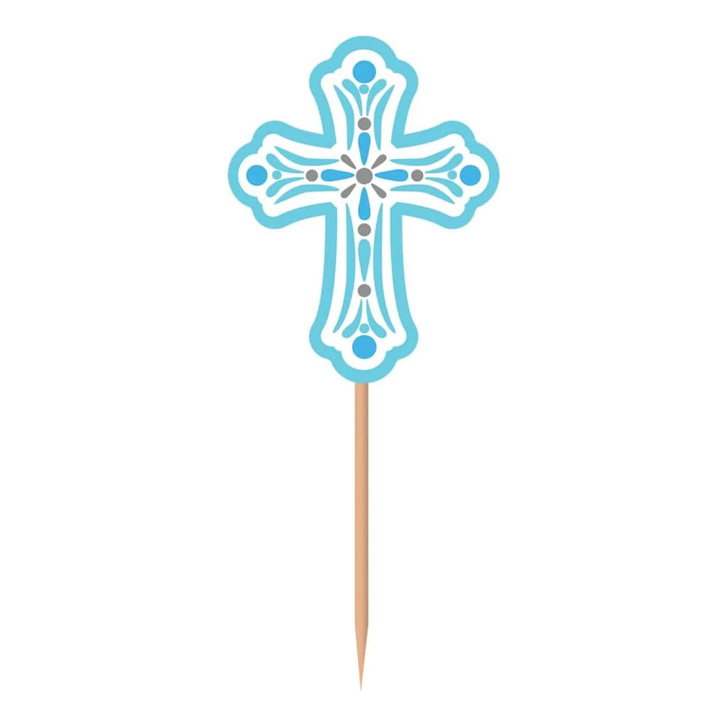 There is joy in details β our Blue Communion Party Picks featuring blue cross cut-outs on toothpicks are perfect for baptism, christening, communion, confirmation parties. Hands will surely reach for your homemade treats when you design your sweets with our Blue Communion Party Picks! These mini blue paper crosses, decorated with an ornate design, are attached to the tops of wooden toothpicks. Simply press these into the tops of your cupcakes, brownies, or cookies for an easy way to decorate.