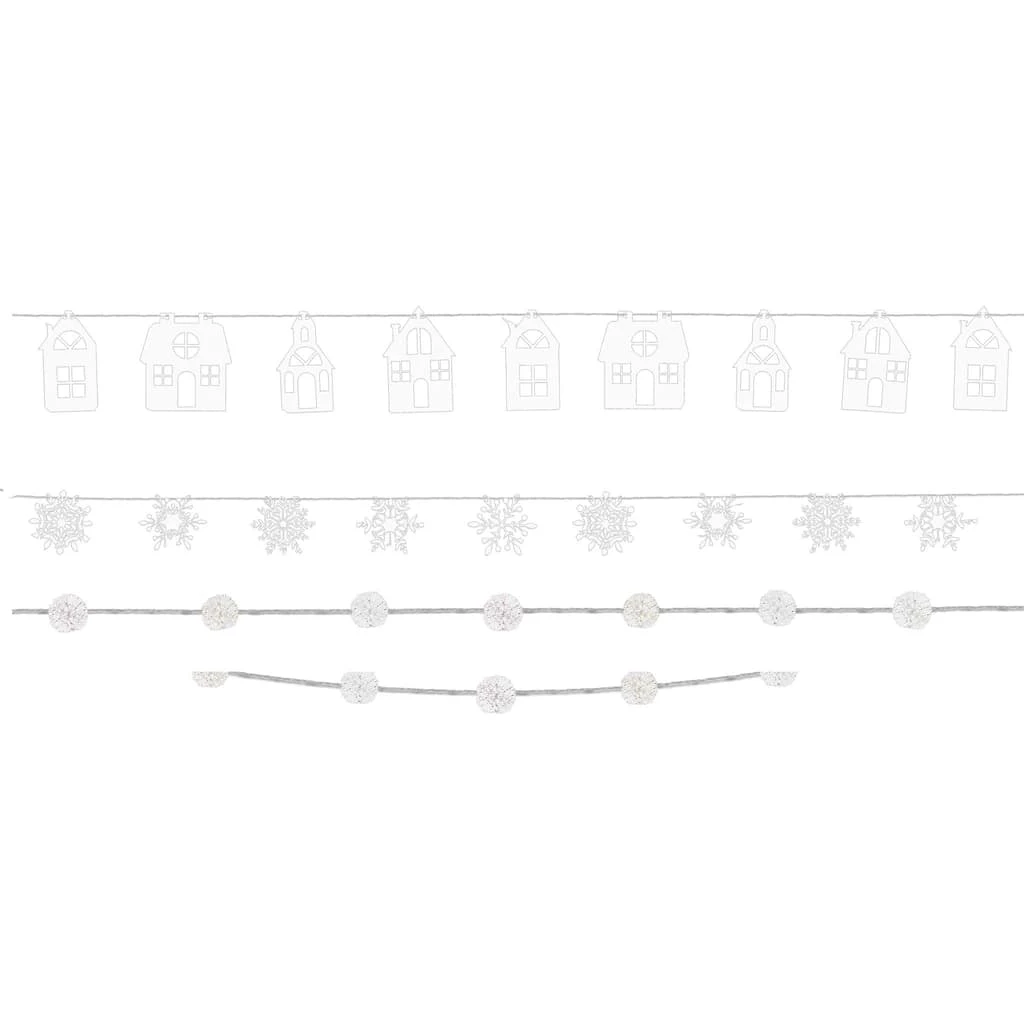 Let it snow with these Christmas Snowy 3-Pack Banners. Each pack includes a white pom-pom banner, unique snowflake banner, and house silhouette banner. Perfect for decorating for the winter festivities.