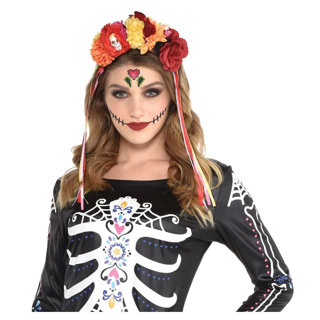 Show off your Dia de Los Muertos spirit with this floral Day of the Dead Headband. Vibrant faux marigolds and Roses in warm hues are a beautiful complement to the adorned resin skull embellishment. The sturdy satin-wrapped headband will keep it secure on your head, too. Perfect for honoring those you have lost or for using as a unique accessory.