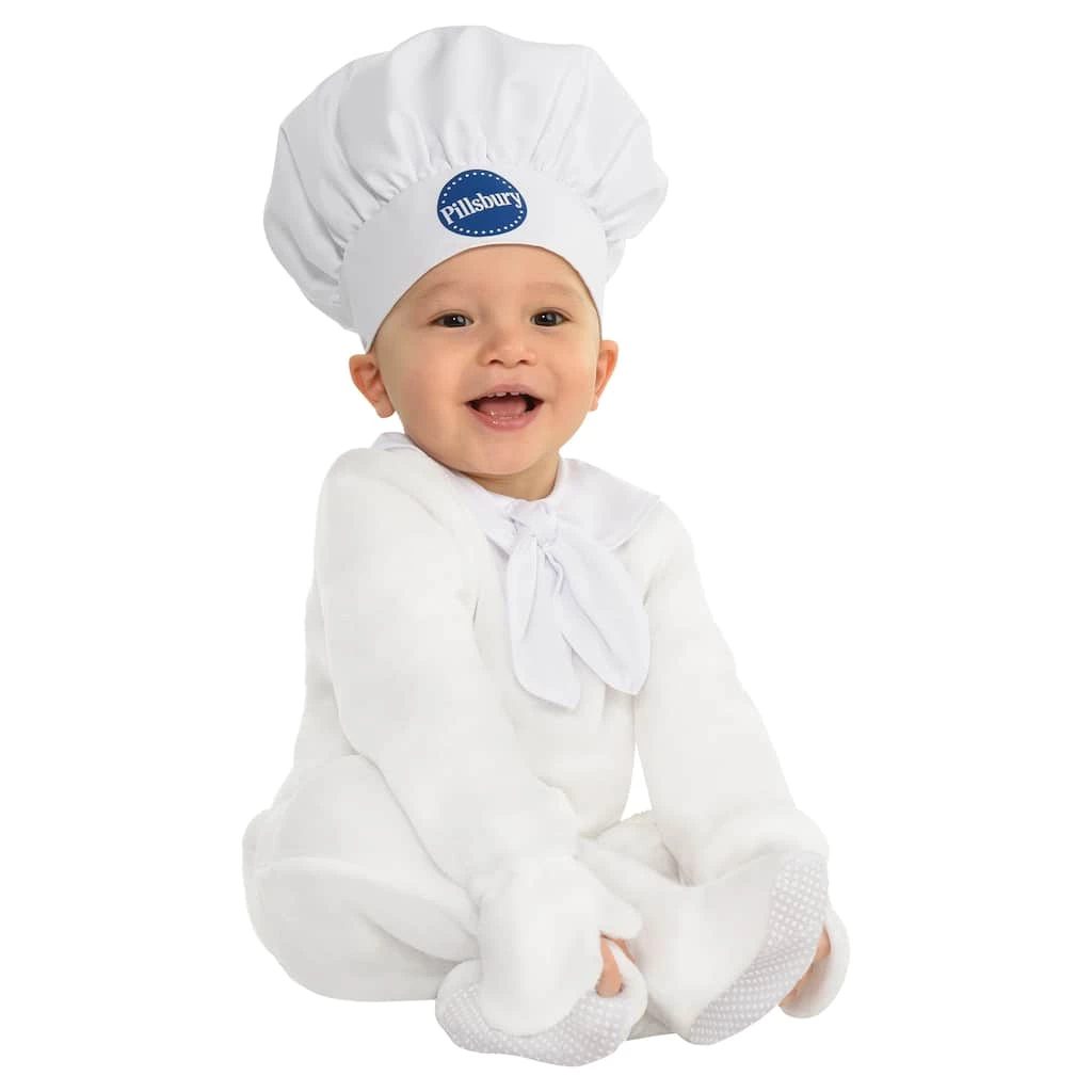 Your little one will be the sweetest one around when they wear this Pillsbury Doughboy Infant Costume. This adorable costume features a velour jumpsuit with attached mittens and booties and matching white chef hat. The jumpsuit features an easy to use hook-and-loop closure, snaps around the legs, non-skid details on the foot covers, and elastic around the wrist and ankles for a secure fit.