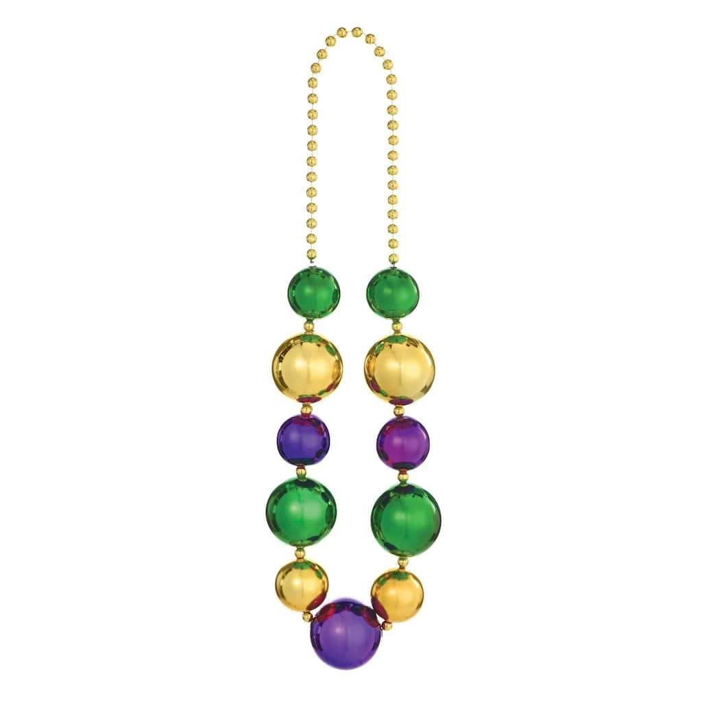 Mardi Gras just wouldn’t be the same without beads! This colorful and unique necklace features massive green, gold, and purple beads spaced by smaller gold beads. Everyone will be checking you out when they see this unique and attractive piece. With four necklaces per pack there are enough for your whole posse.