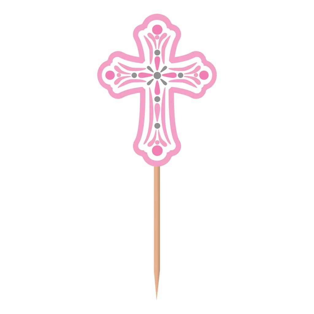 There is joy in details β our Pink Communion Party Picks featuring blue cross cut-outs on toothpicks are perfect for baptism, christening, communion, confirmation parties. Hands will surely reach for your homemade treats when you design your sweets with our Pink Communion Party Picks! These mini blue paper crosses, decorated with an ornate design, are attached to the tops of wooden toothpicks. Simply press these into the tops of your cupcakes, brownies, or cookies for an easy way to decorate.