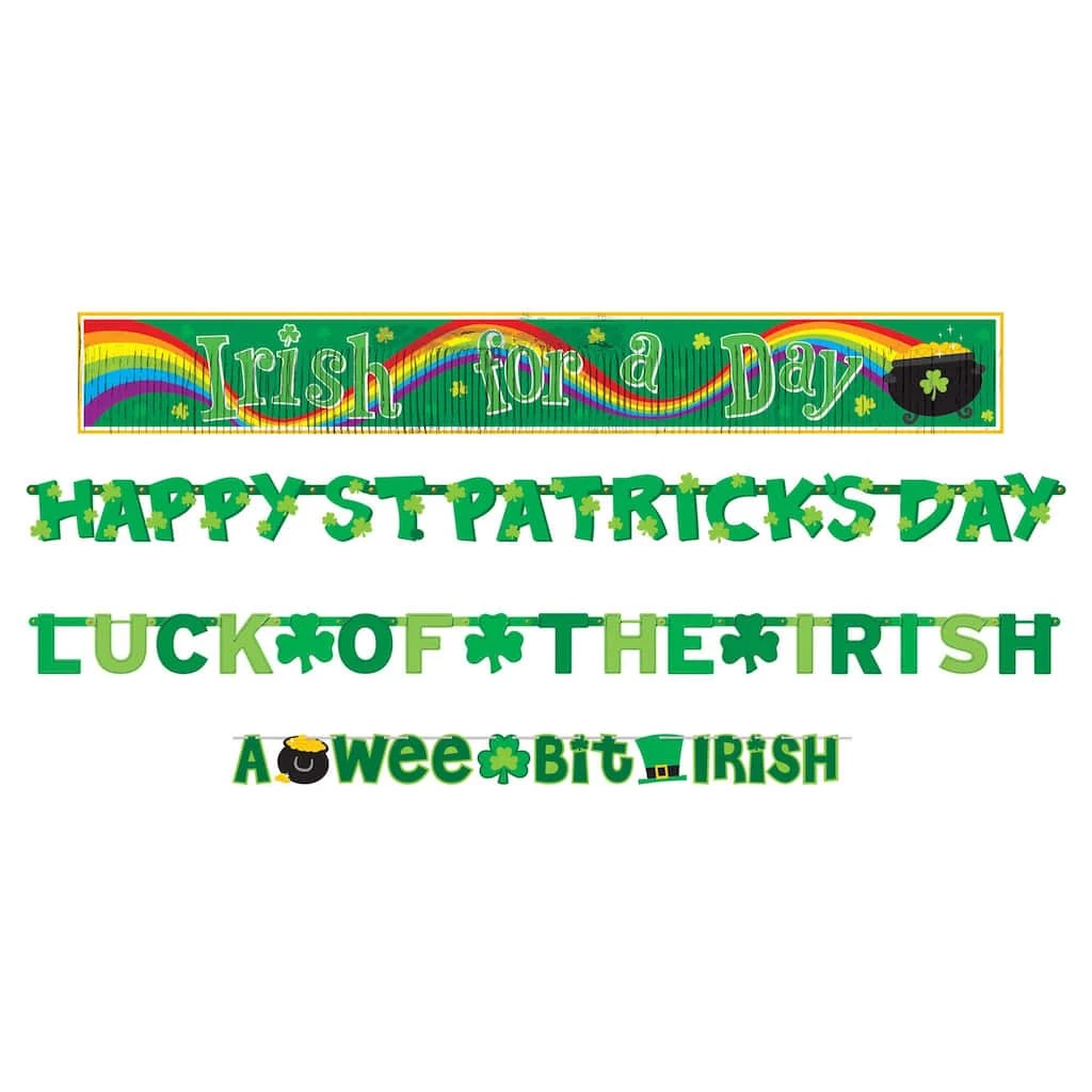 Get ready for St. Patrick with our St. Patrick’s Day Value Pack of Banners feature four different messages! Get ready for a big green shindig and quickly decorate your space with our St. Patrick’s Day Value Pack of Banners! This multi pack includes two printed foil banners that say “Irish For A Day” and “Luck Of The Irish” as well as two printed paper banners that say “A Wee Bit Of Irish” and “Happy St. Patrick’s Day.”