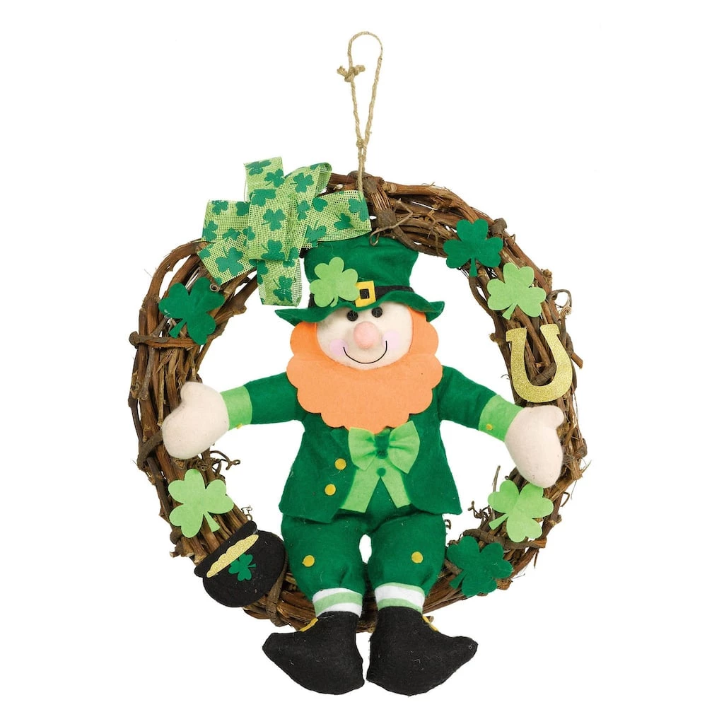 Bring the luck of the Irish to your door with this St. Patrick’s Day Grapevine Wreath. This fun and festive wreath features a smiling and waving leprechaun sitting on a wreath decorated with clovers, pots of gold, and a green ribbon. Suitable for indoor and outdoor use, this wreath will bless your home with luck and cheer.